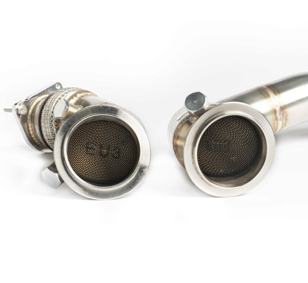 Catalisadores de alto fluxo para BMW F80/F82 M3/M4/M2 Competition. Estes downpipes de aço inoxidável de alto fluxo proporcionam uma resposta mais rápida do turbo, melhor desempenho em médias rotações, maior pressão de turbo e um som incrível. Estes downpipes são a primeira parte do nosso sistema de escape modular e são compatíveis com os silenciadores intermediários originais e com os nossos futuros silenciadores intermediários CTS Turbo. Espere ganhos significativos de torque quando combinados com o software de reprogramação apropriado.